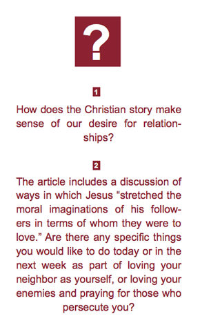 Once we reflect on the quality of relationship that characterizes God’s own being, we are not surprised that the content of Christian ethics centers on love and service to others. Jesus continually stretched the moral imaginations of his followers in terms of whom they were to love. He named the second most important law, the law to “love your neighbor as yourself.” (Matthew 22:39) When someone asked him, “And who is my neighbor,” (Luke 10:29) Jesus broke down the walls that had been erected to confine love. It is clear that the one who raised this question was seeking to limit the kind of people he was obligated to love. In response Jesus told the story about a man who was regarded as an outcast. This man crossed racial, religious, and cultural barriers to help a person in need. Jesus did not answer the question of the identity of our neighbor. Calculating whom it is that we are supposed to love, as if we can draw these kinds of boundaries, is to miss the point altogether. Rather, we should live as this man lived. We are to be neighbors who reach out to anyone in need.