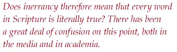 Does inerrancy therefore mean that every word in Scripture is literally true? There has been a great deal of confusion on this point, both in the media and in academia. It should first be noted that mere words are neither true nor false; truth is a property of statements. Second, those who oppose biblical inerrancy have all too often contributed to the confusion by caricaturing the notion of literal truth. Critics of inerrancy typically speak of “literal truth” when what they really mean is “literalistic truth.” Defenders of inerrancy must take great care to distinguish the notion of literal truth from the kind of literalistic interpretation that runs roughshod over the intent of the author and the literary form of the text.
